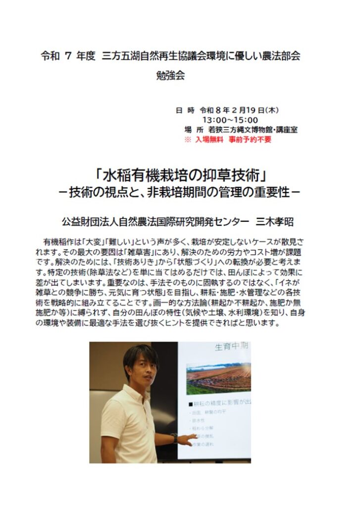 三方五湖自然再生協議会 環境に優しい農法部会で、勉強会を開催します。