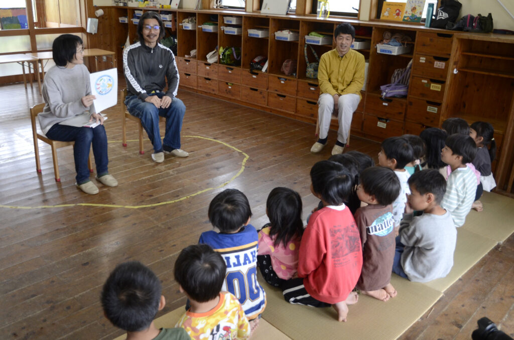 食べる前には、島光さん夫妻と園児たちで、生き物がたくさんいる田んぼの話や、そこに来るコウノトリの話をするなど、交流を深めました。